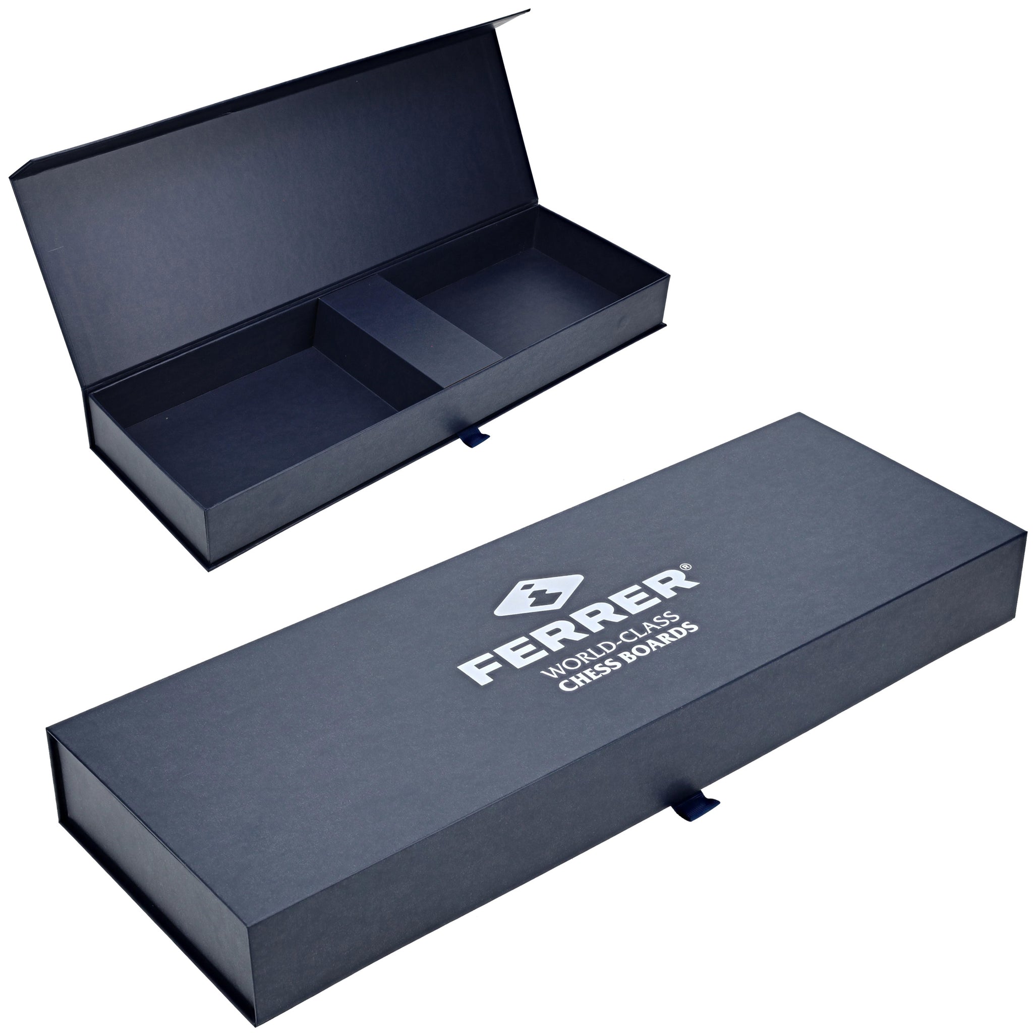 In addition, this board comes with a luxury storage box. Featuring a soft touch exterior in a refined navy-blue color, this sturdy cardboard box folds open to reveal dedicated storage for both your board and your personal chess pieces.